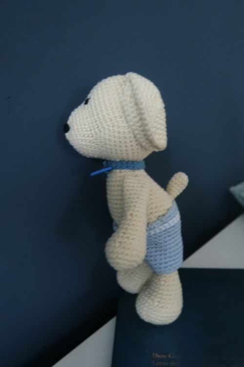 Kleiner vanillegelber Hund Snupi mit blauer Badehose.